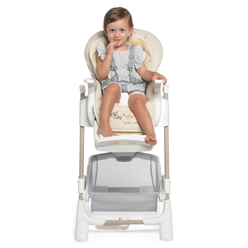 Podešavanje visine u 7 položaja, naslon za leđa podesiv u 4 položaja i pogodan za upotrebu od rođenja, oslonac za noge podesiv u 3 pozložaja po visini i dužini, 2 poslužavnika, pregrade za odlaganje, presvlaka od veštačke kože, navlaka od tkanine sa dva lica za leto/zimu, sigurnosni pojas sa 5 tačaka za vezivanje, prečka za mekane igračkice, sa zvončićem, malim ogledalcem i zvečkom koje se mogu skidati, može se pričvrstiti na 2 pozicije (na naslonu za ruke i ručkama sa strane), zadnji točkovi, prostrana korpa.