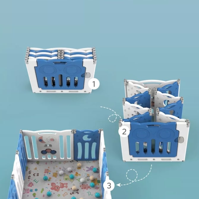 Od panela u kompletu možete napraviti pravougaonik 123*245 cm ili sastaviti ogradicu manjih dimenzija.