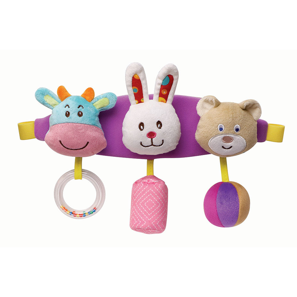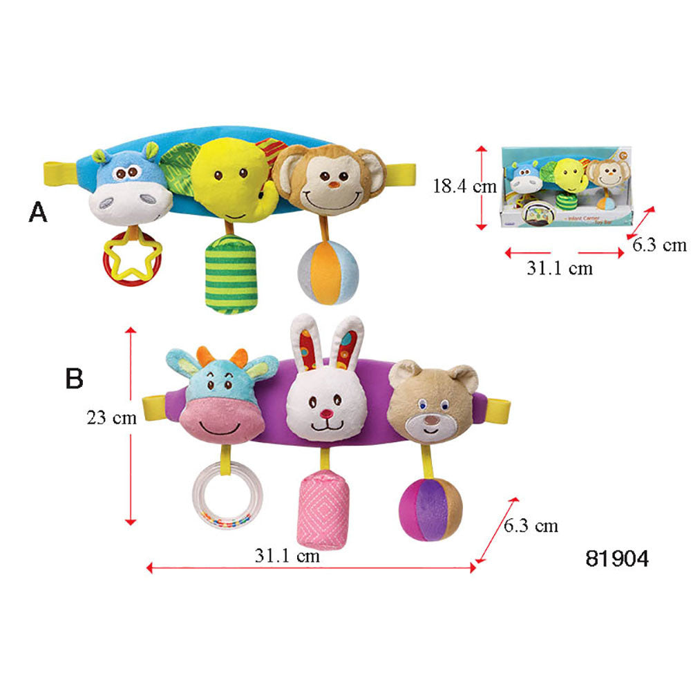Tri Vesela plišana lika životinja sa igračkama. Nilski konj sa plastičnim prstenovima, majmunče sa plišanom lopticom i slonče sa čima zvukom, svakako će zabaviti svako dete. Stimuliše bebu na interaktivnu igru.